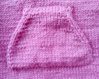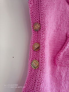auf der Vorderseite in 15, 21 und 27 cm cm Höhe jeweils ein Knopfloch arbeiten ( 2 M zusammen stricken, 1 Umschlag)